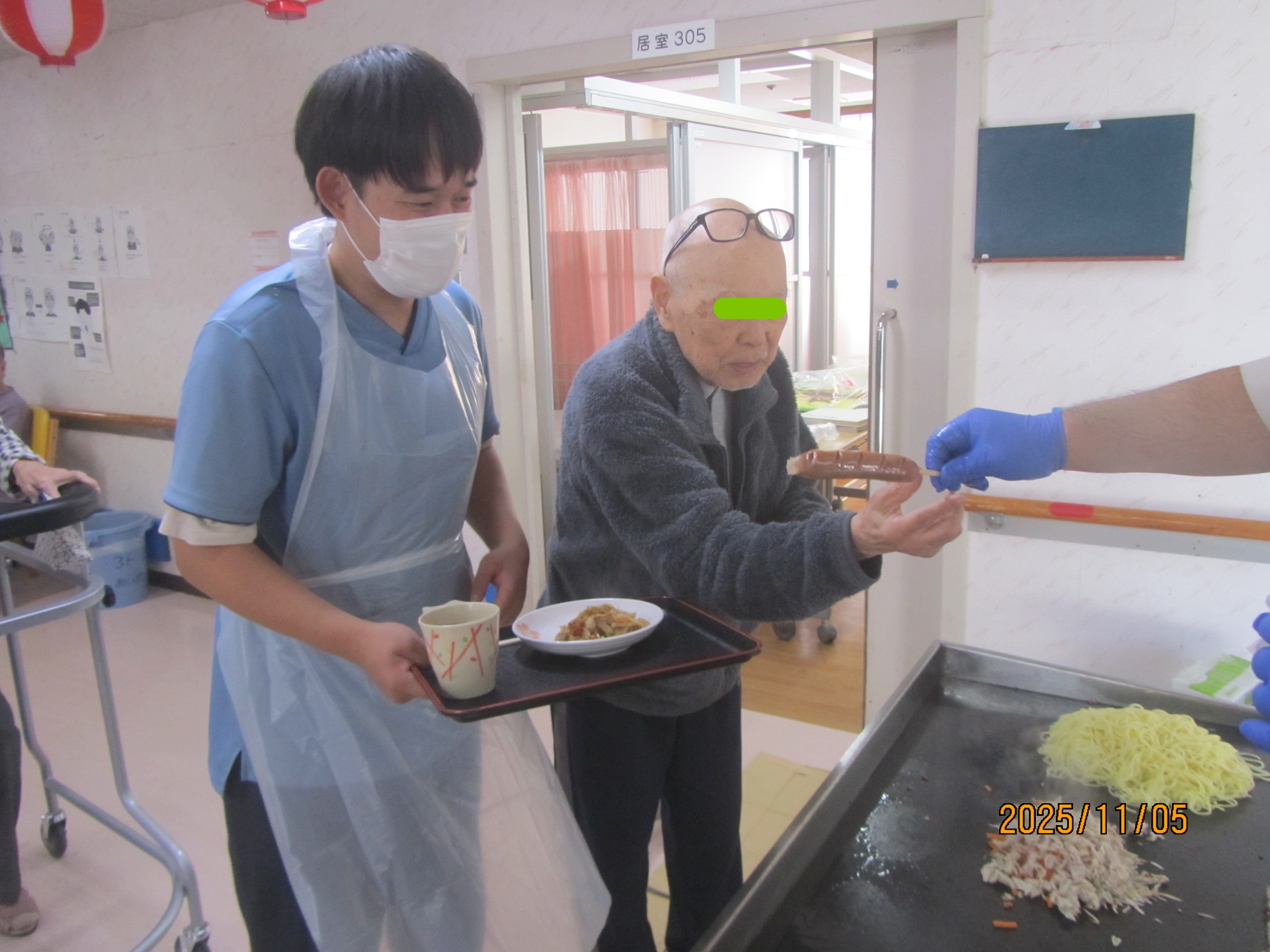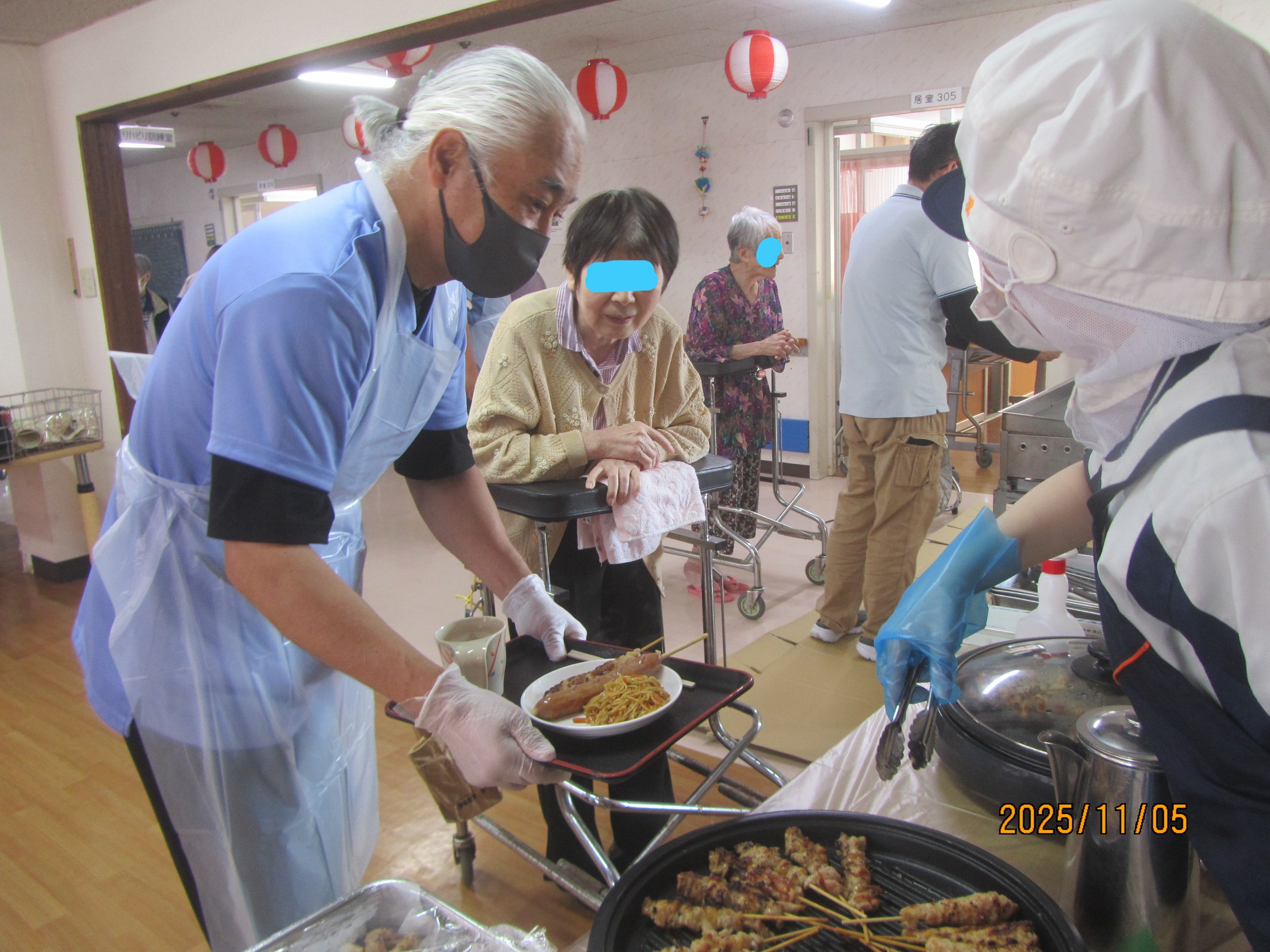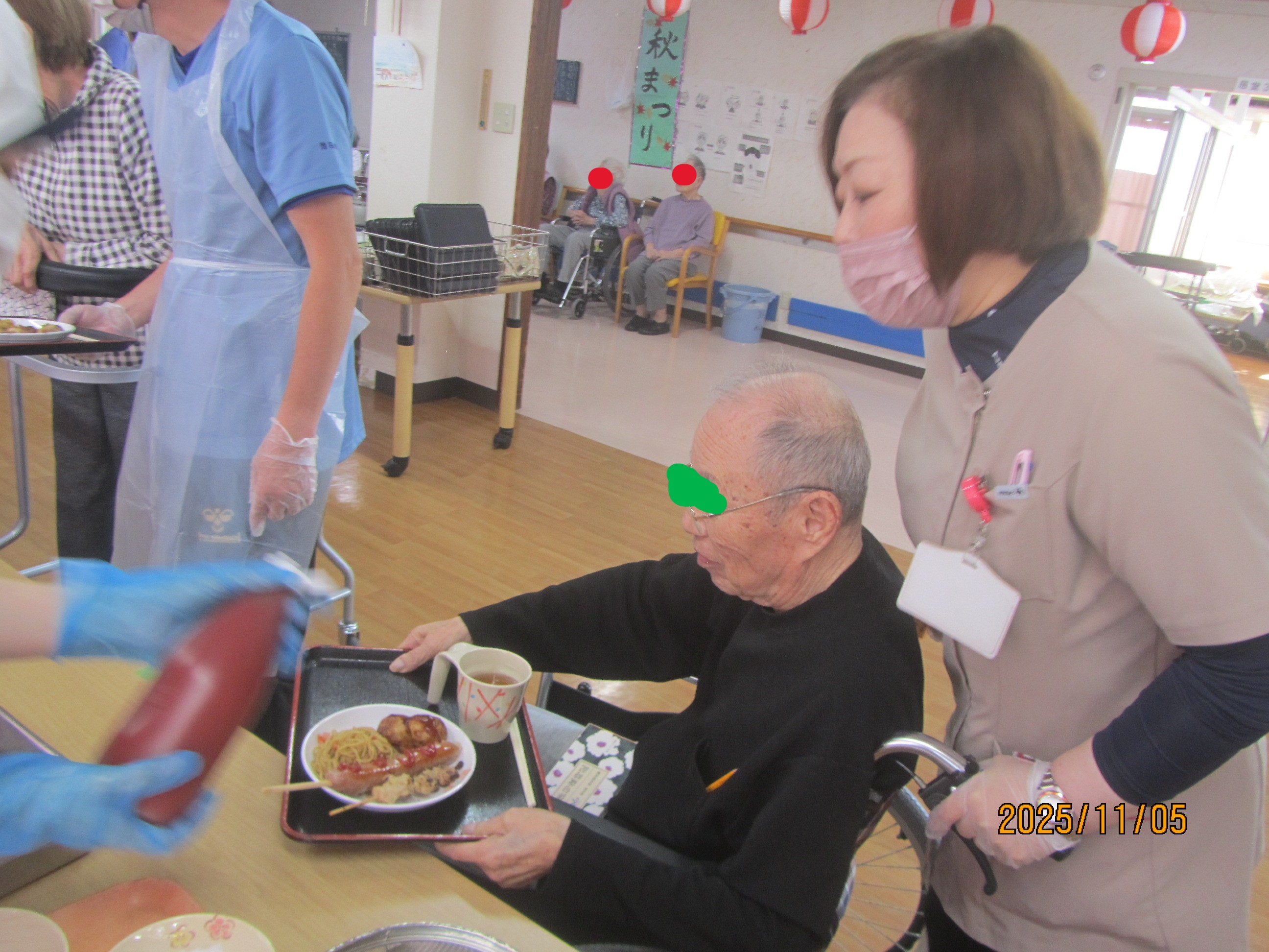 秋祭り 2025年 11月 6日 Thu 管理者 令和7年11月5日 水曜日 温品荘恒例の「秋祭り」を行いました。 屋台で好きなものを食べていただきました。 ・焼きそば ・焼鳥 ・フランクフルト ・たこ焼き ・枝豆 ・フルーツ(バナナ) ・塩むすび 年間行事