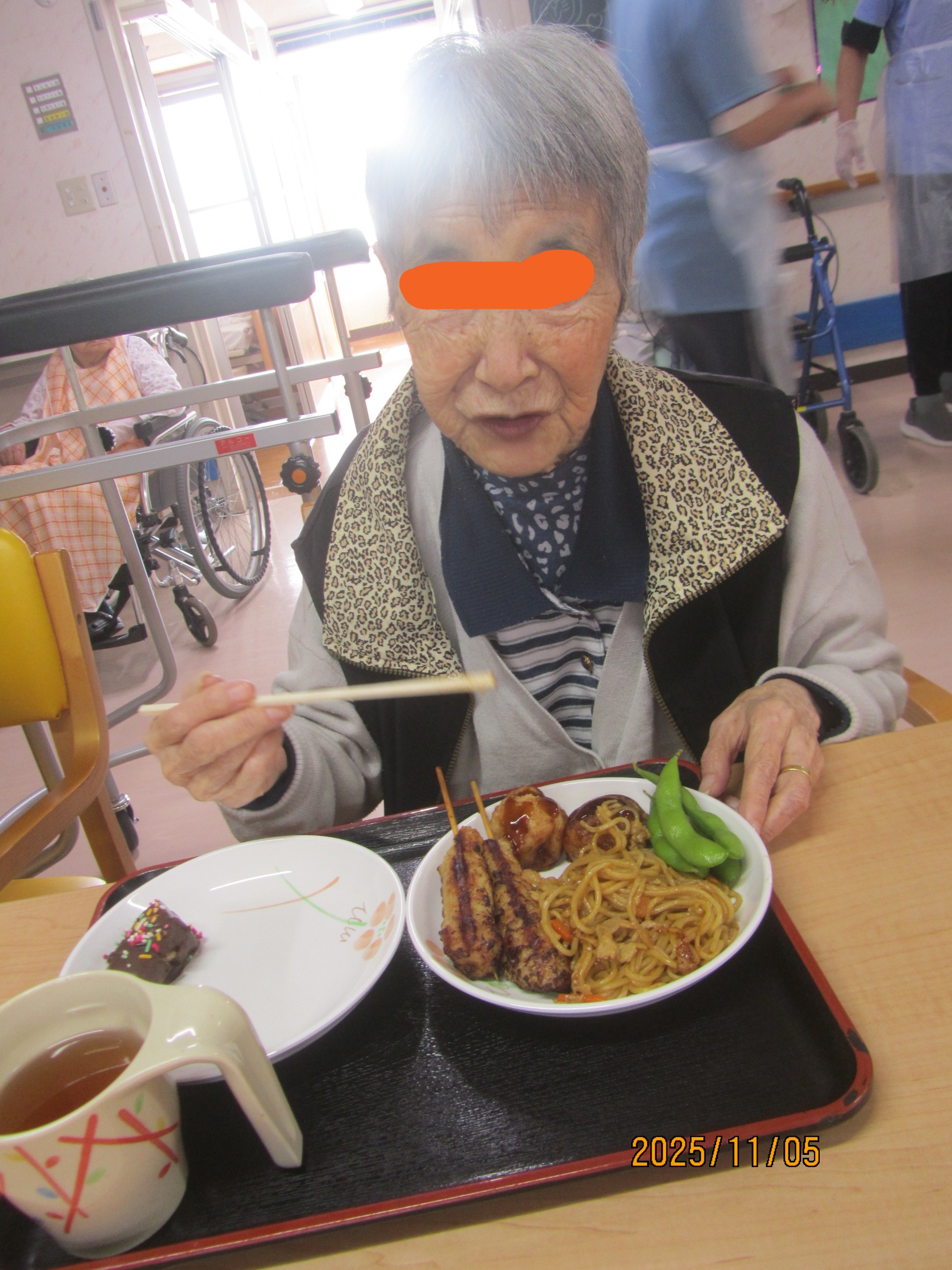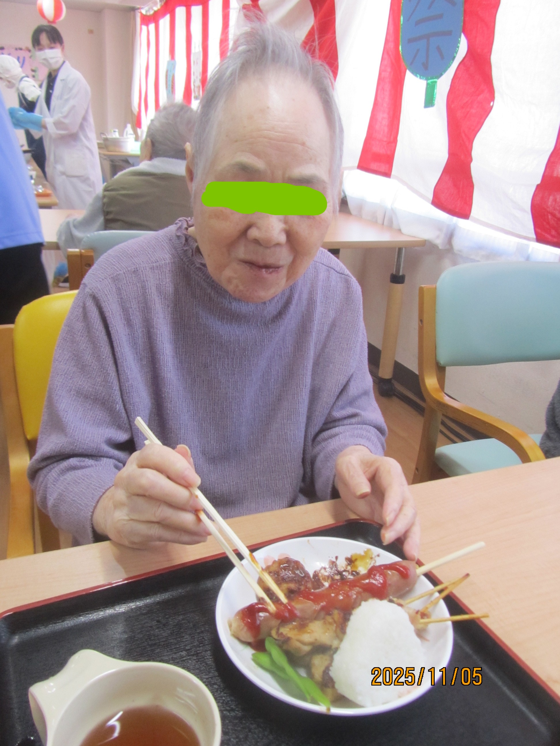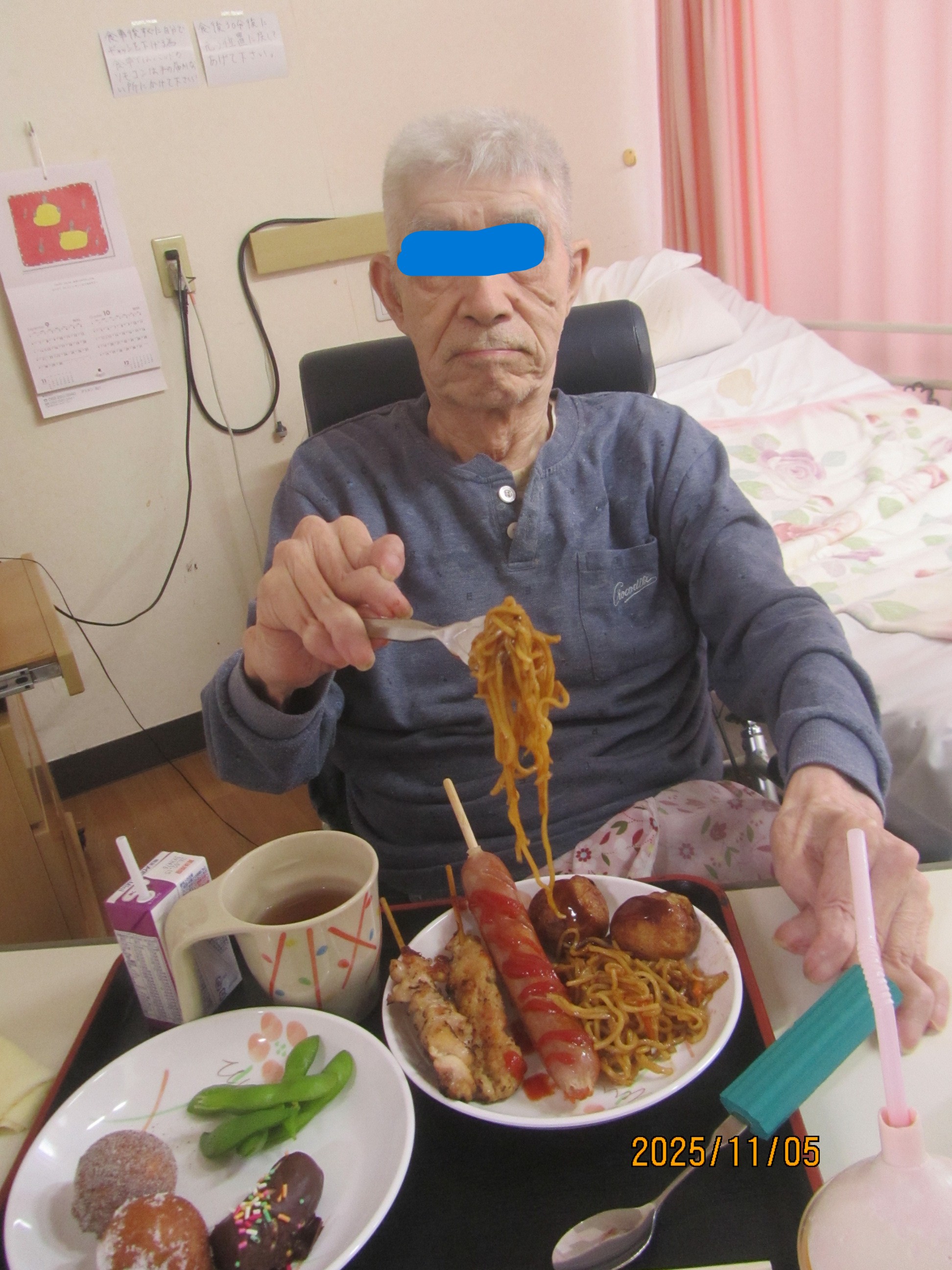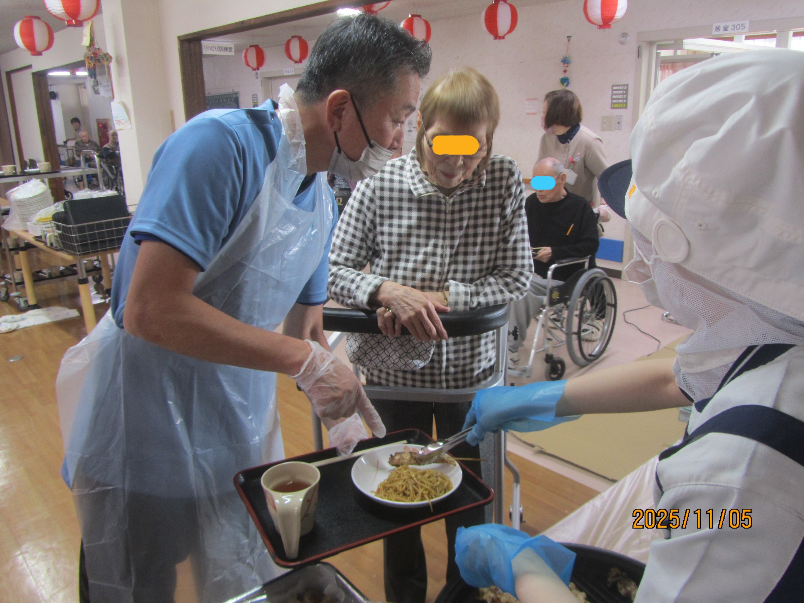 秋祭り 2025年 11月 6日 Thu 管理者 令和7年11月5日 水曜日 温品荘恒例の「秋祭り」を行いました。 屋台で好きなものを食べていただきました。 ・焼きそば ・焼鳥 ・フランクフルト ・たこ焼き ・枝豆 ・フルーツ(バナナ) ・塩むすび 年間行事